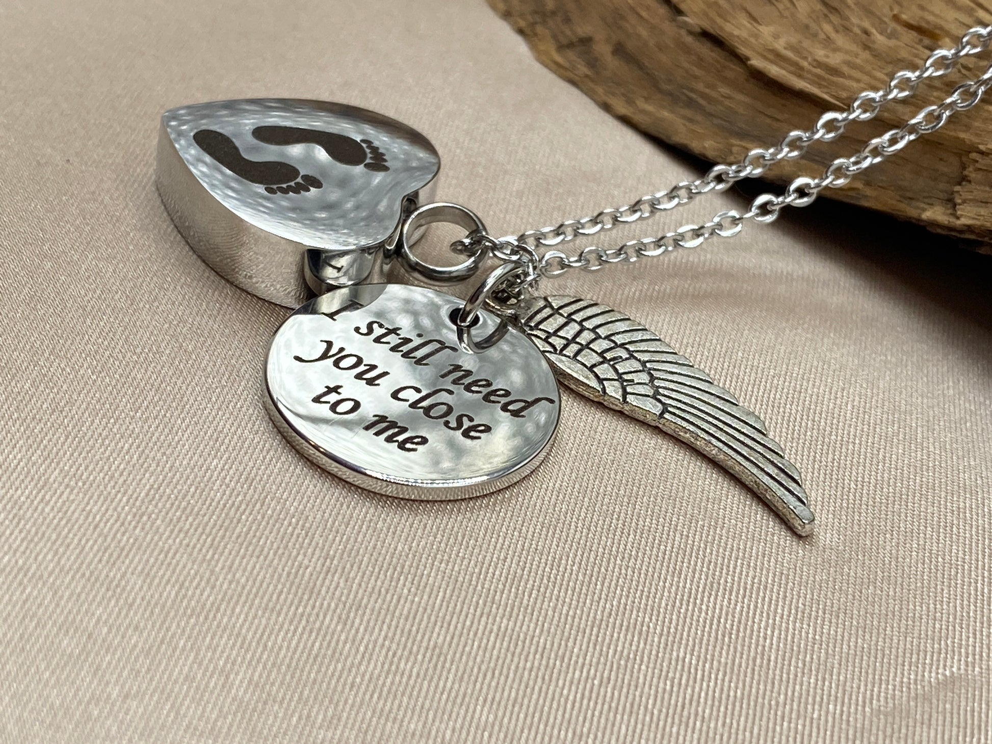 The heart-shaped pendant is engraved with a pair of baby feet—symbolizing love, innocence, and the precious time you shared. Accompanied by a delicate angel wing charm and a round disc engraved with the phrase “I still need you close to me,” this cremation necklace offers a comforting reminder of eternal love and connection.