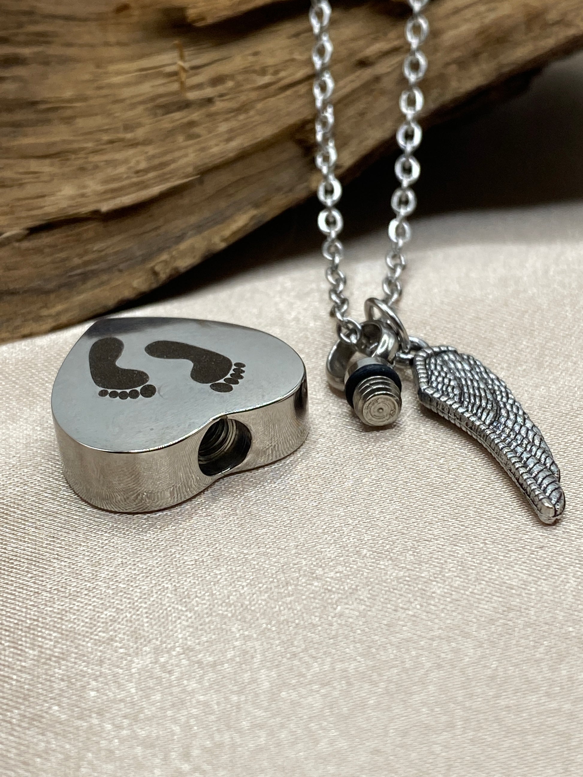 Heart Baby Feet Cremation Necklace with Angel Wing Charm – Memorial Urn Jewelry