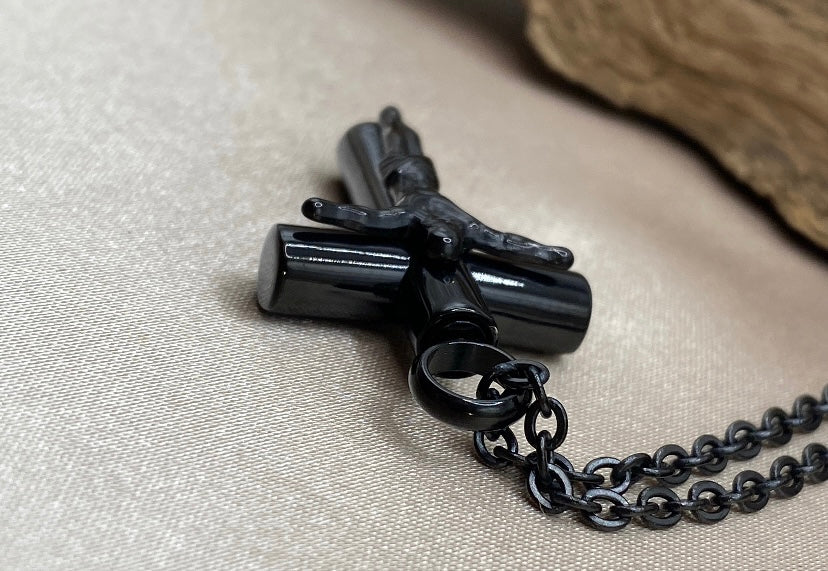 Black Stainless Steel Cremation Urn Cross Necklace with Jesus – Memorial Keepsake Jewelry