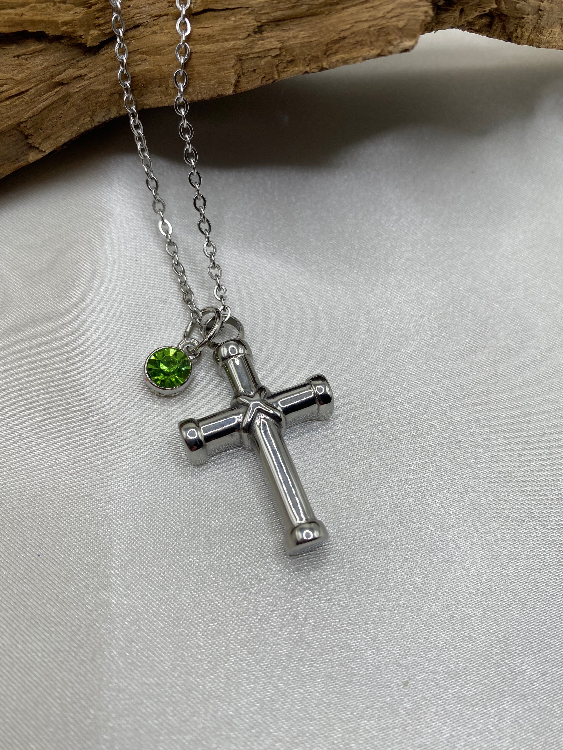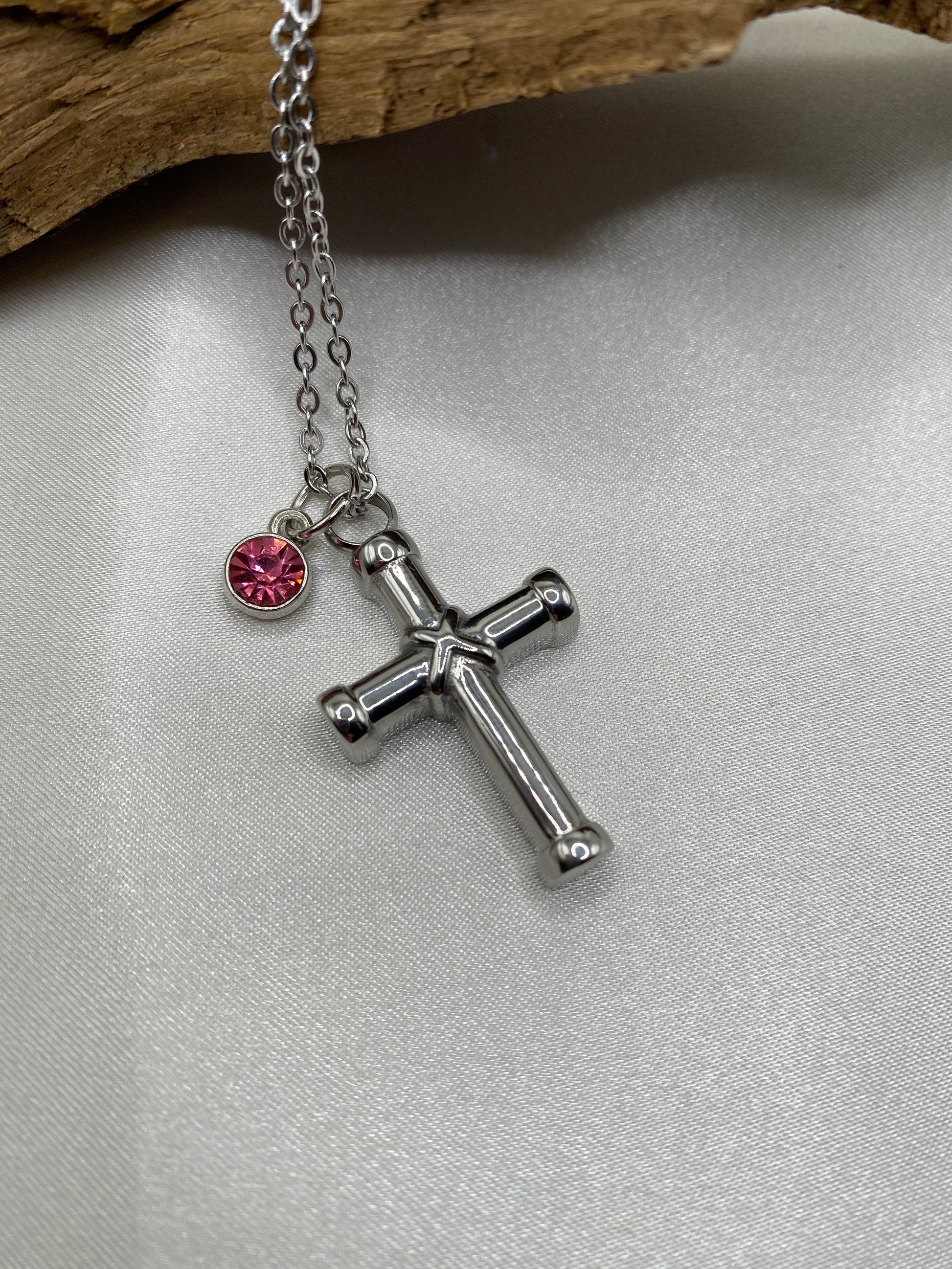 Classic Cross Cremation Necklace with Birthstone – Memorial Pendant