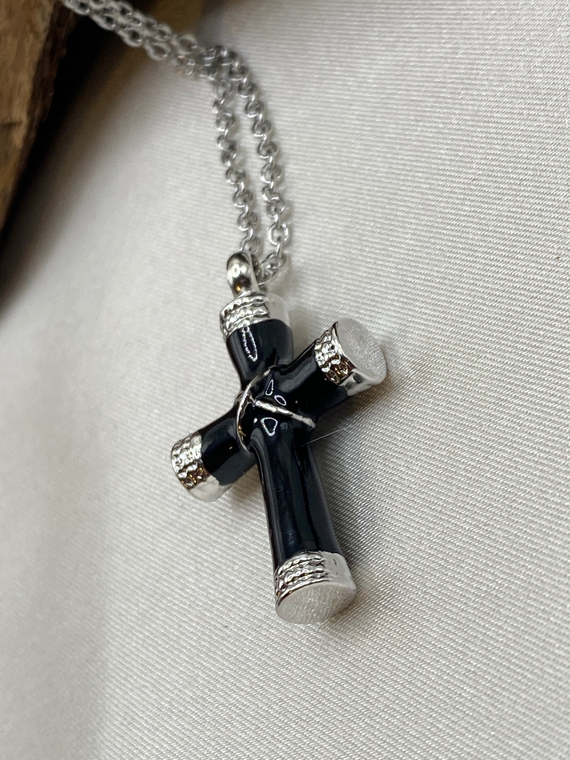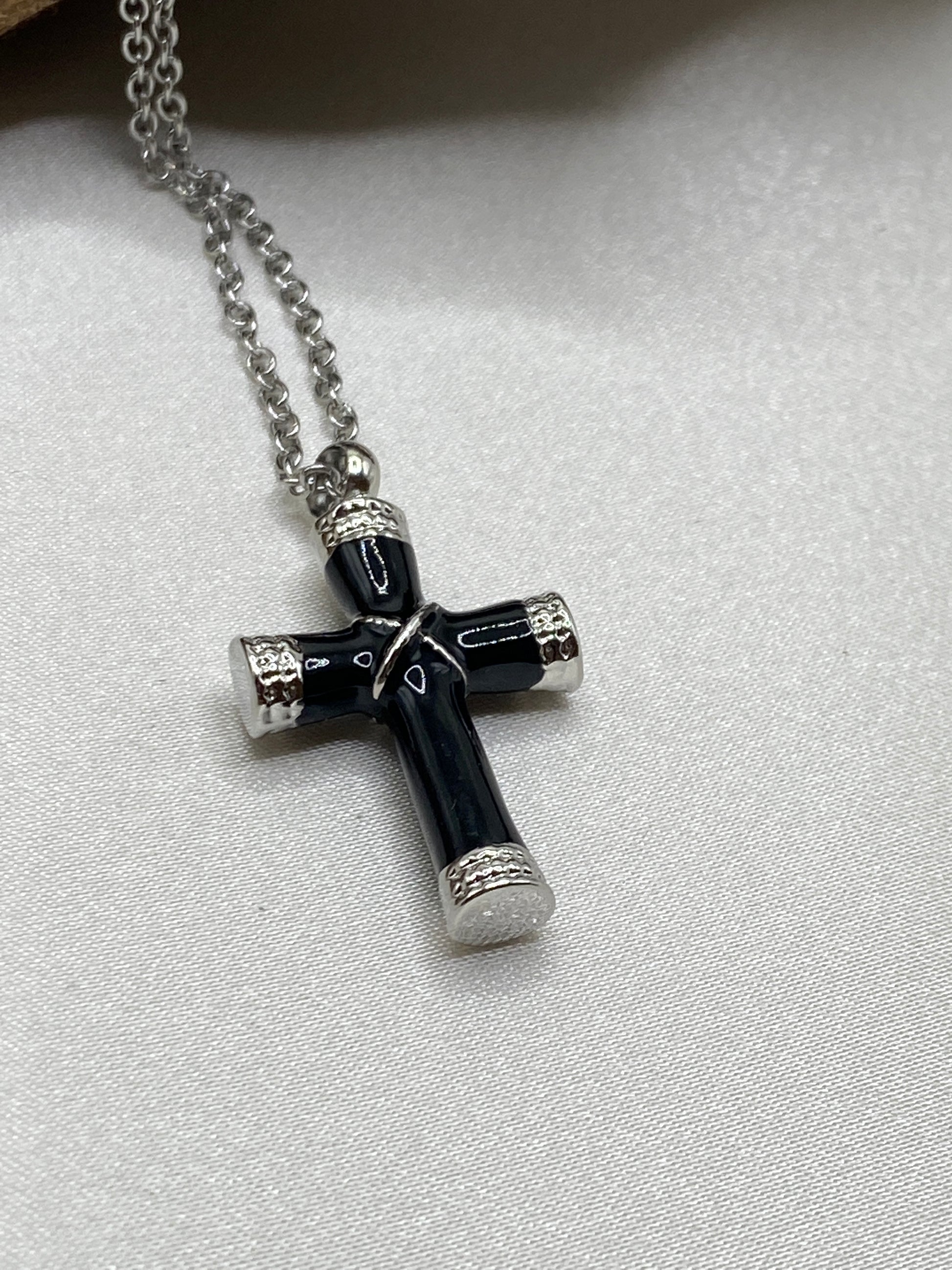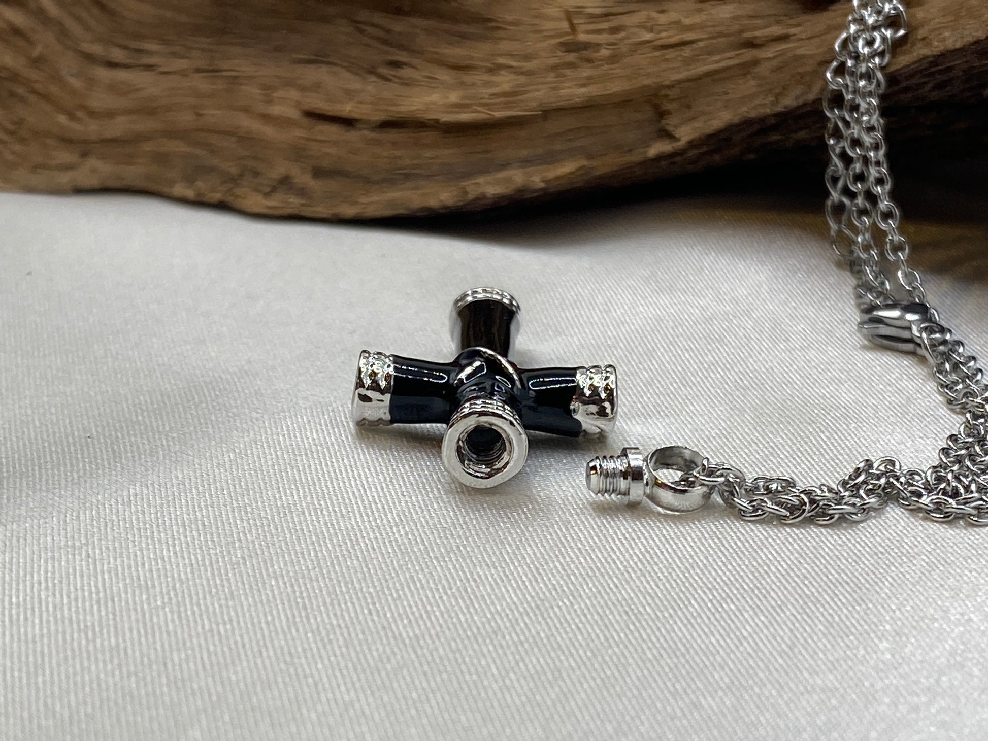 Introducing our sleek and sophisticated black and silver cremation urn cross necklace. This stainless steel necklace serves as a beautiful piece of cremation urn jewelry, suitable for holding either human or pet ashes. Its timeless design effortlessly combines aesthetics with functionality.