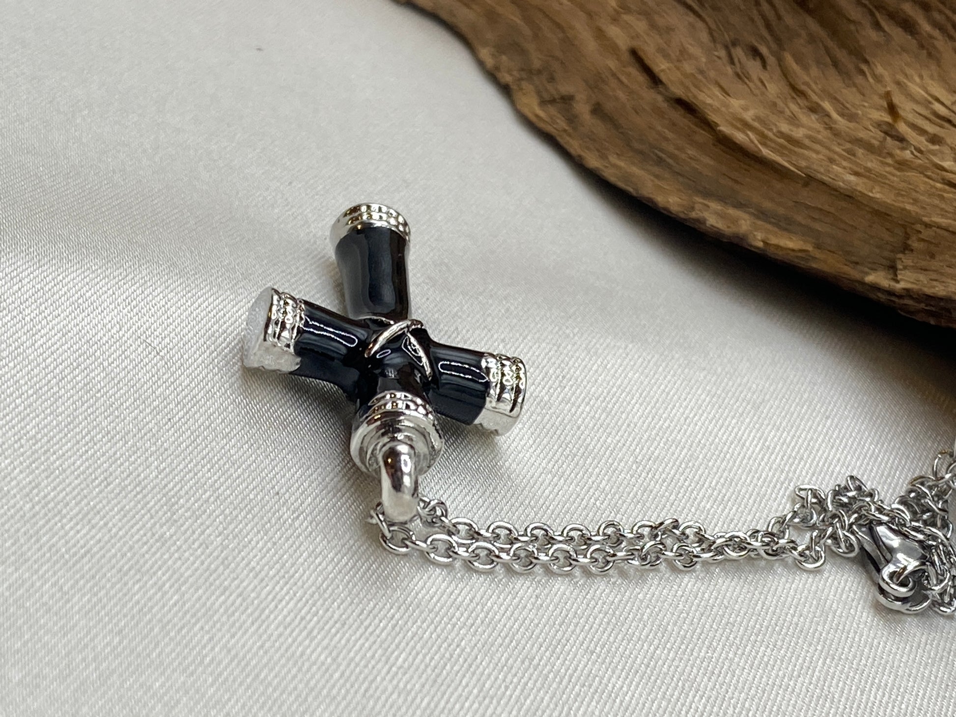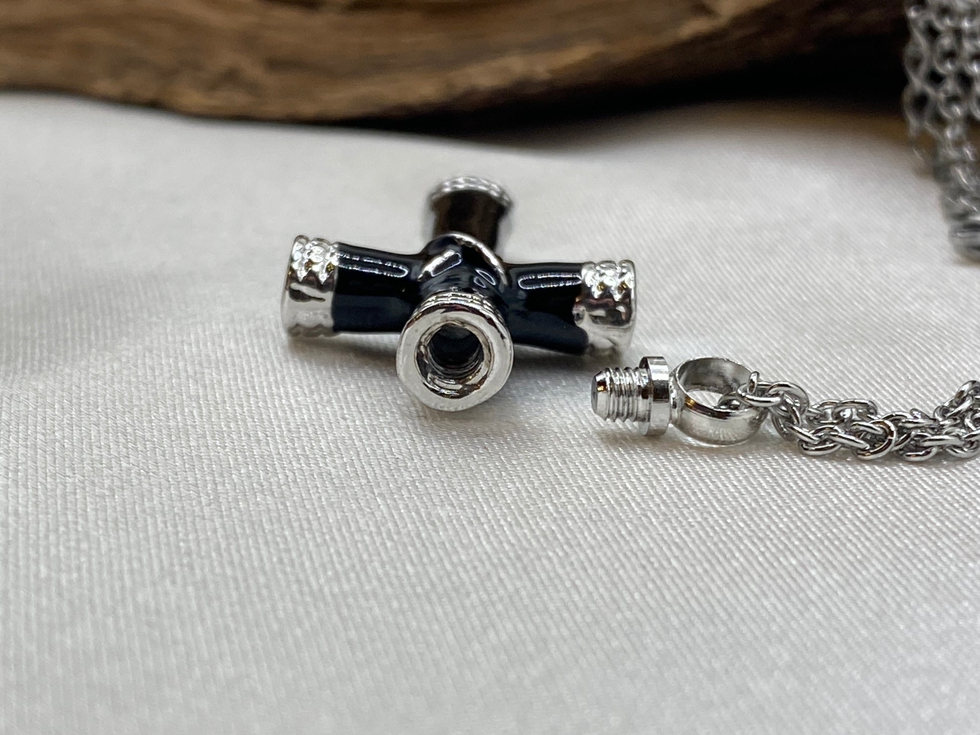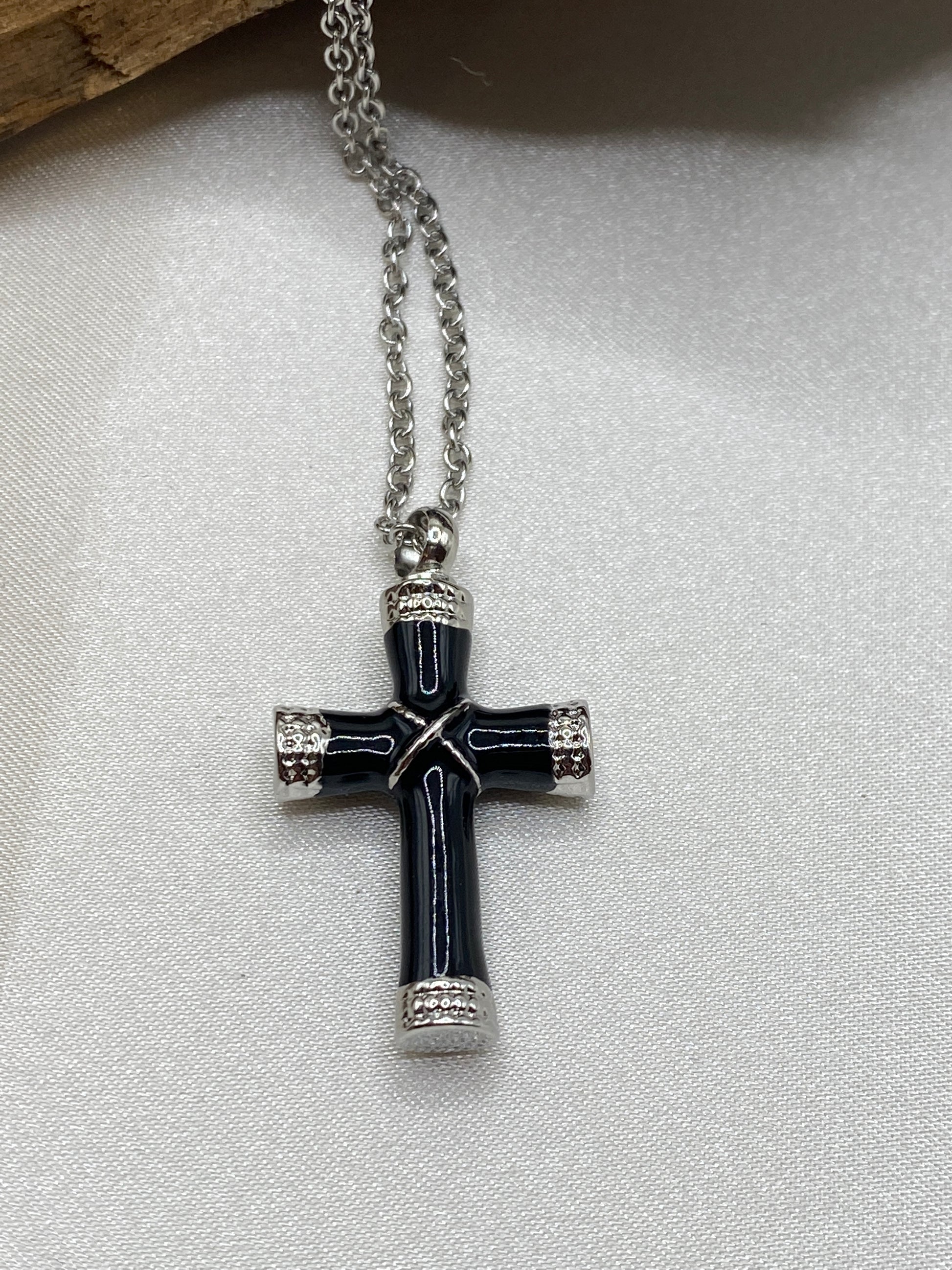 Introducing our sleek and sophisticated black and silver cremation urn cross necklace. This stainless steel necklace serves as a beautiful piece of cremation urn jewelry, suitable for holding either human or pet ashes. Its timeless design effortlessly combines aesthetics with functionality.