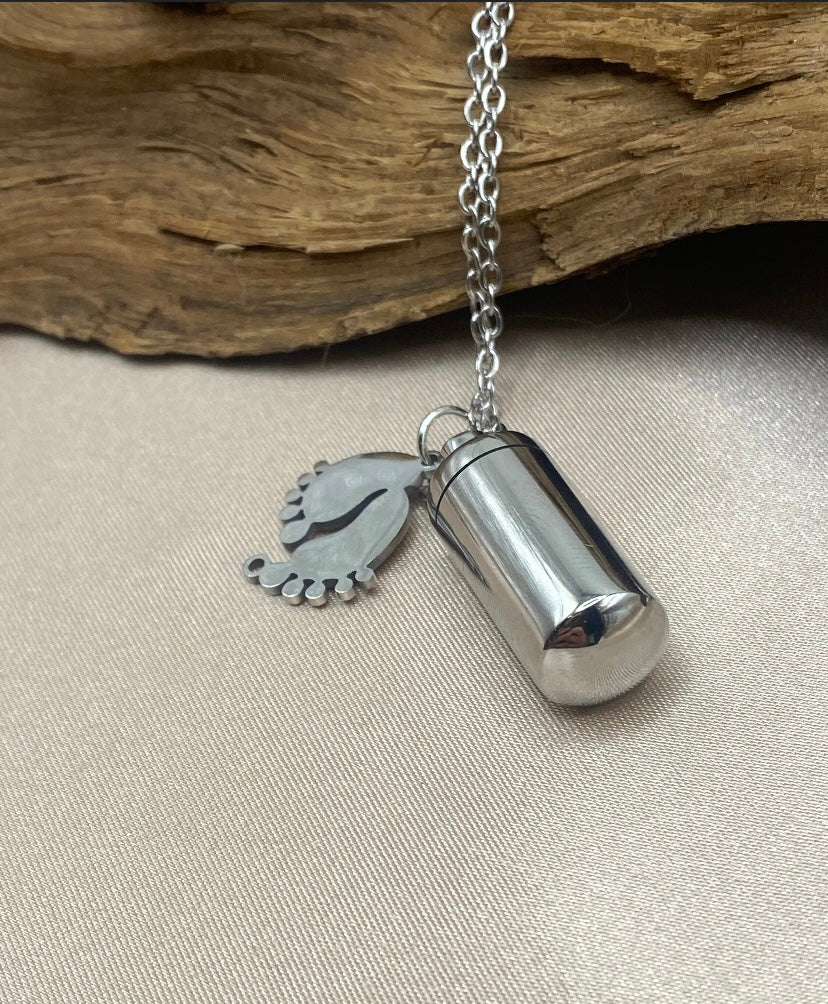 Small Silver Cylinder Cremation Urn Necklace with Baby Feet Charm – A Heartfelt Memorial for Your Beloved Baby
