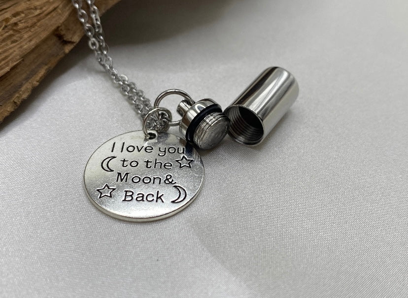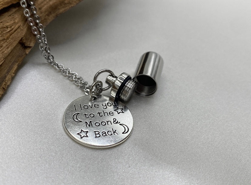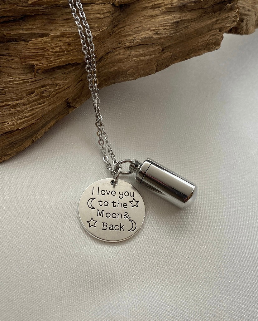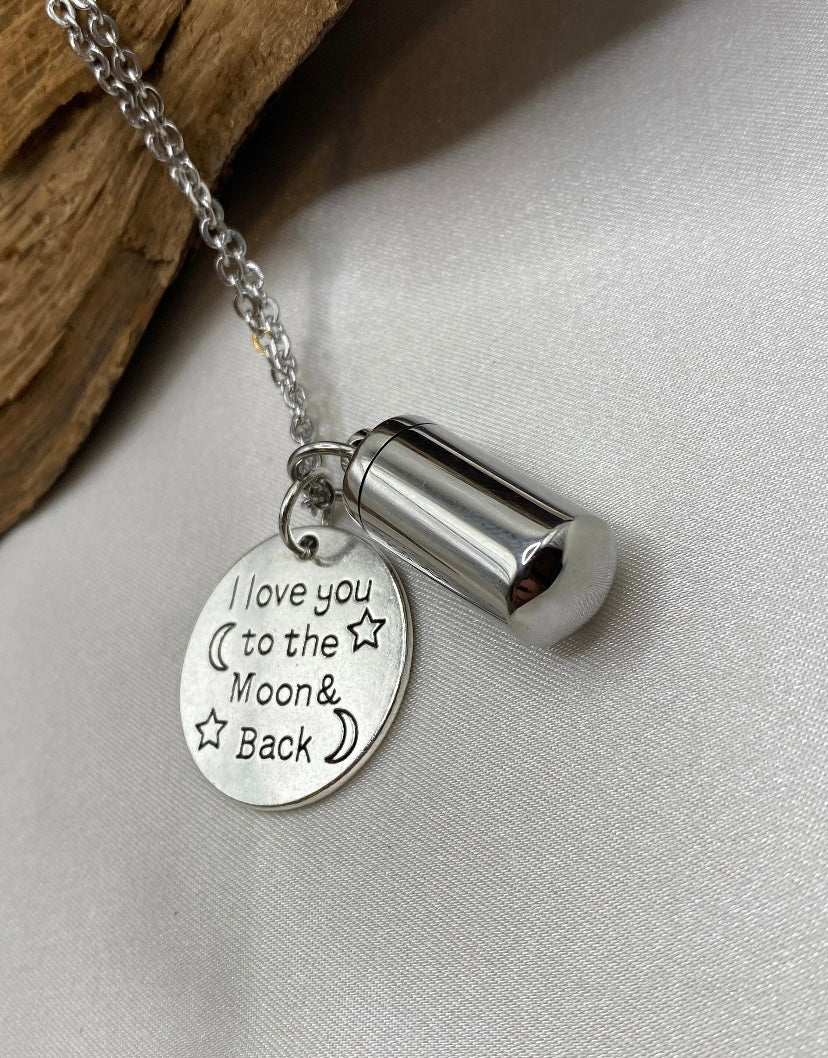 I Love You to the Moon and Back – Moon & Cylinder Urn Necklace for Ashes