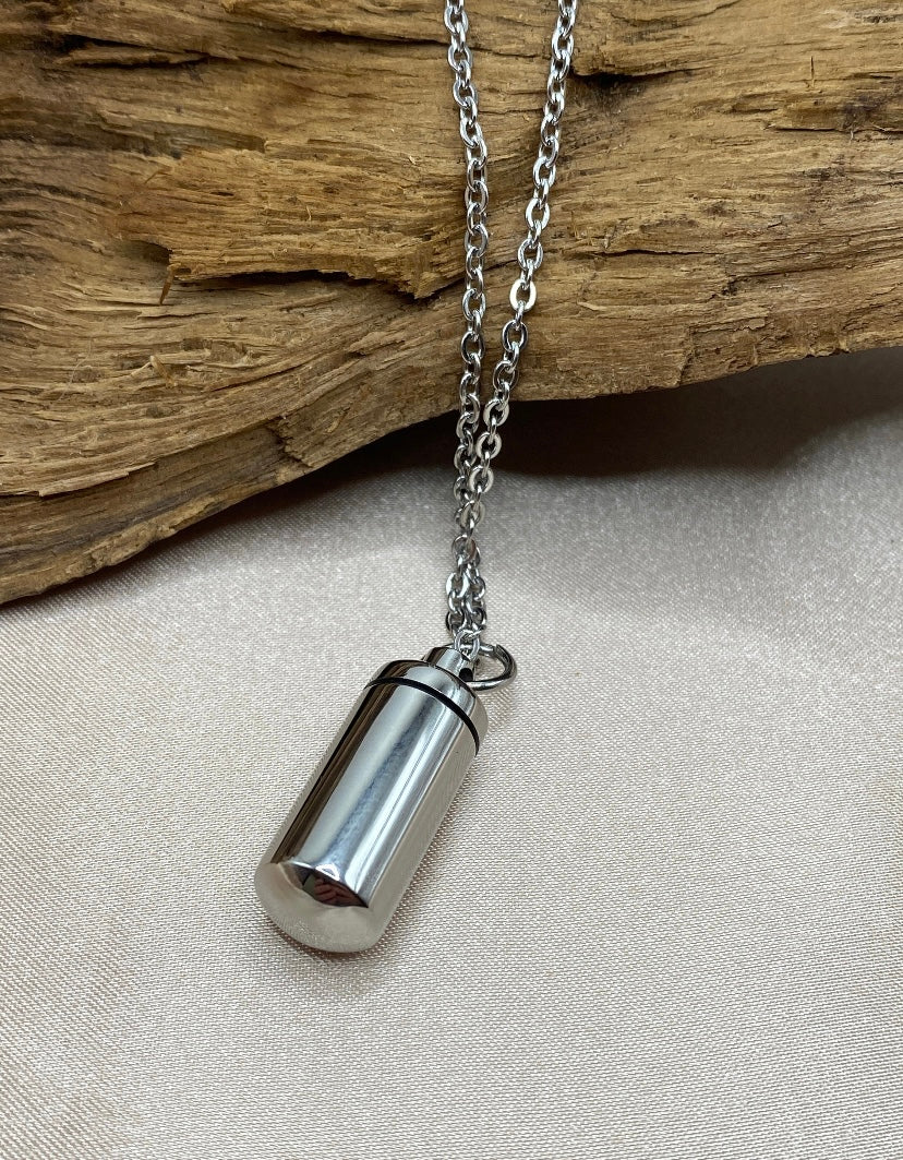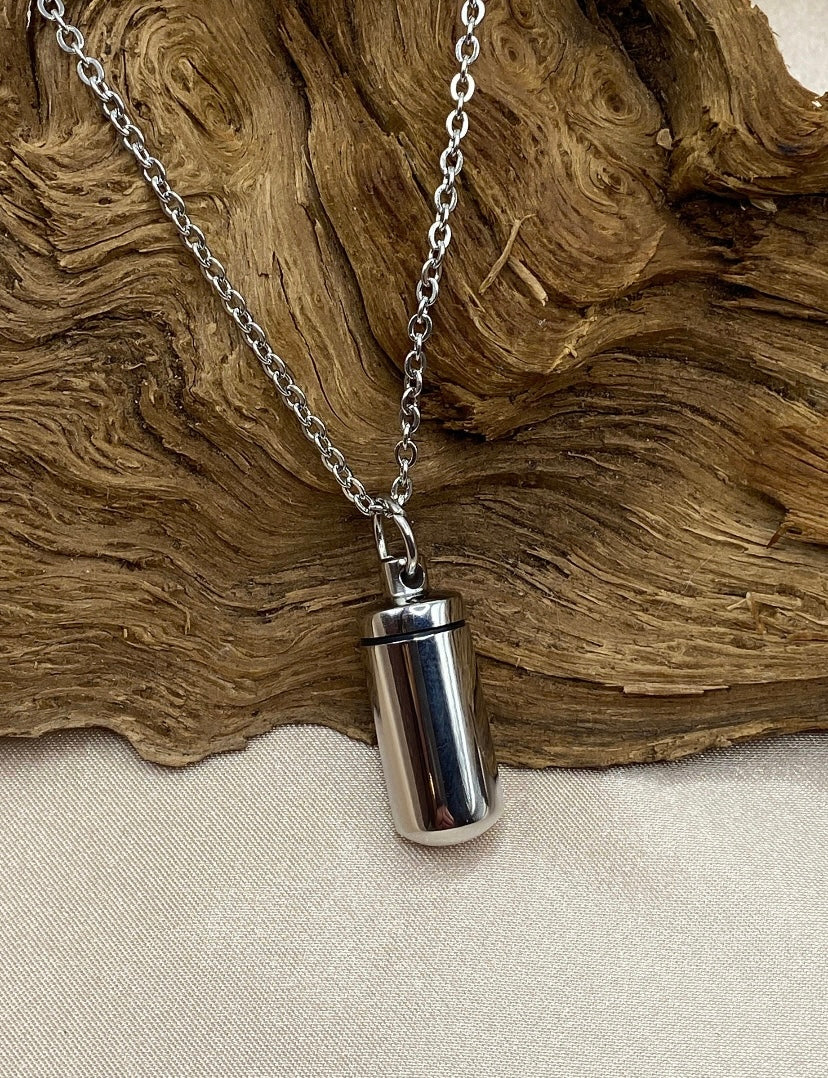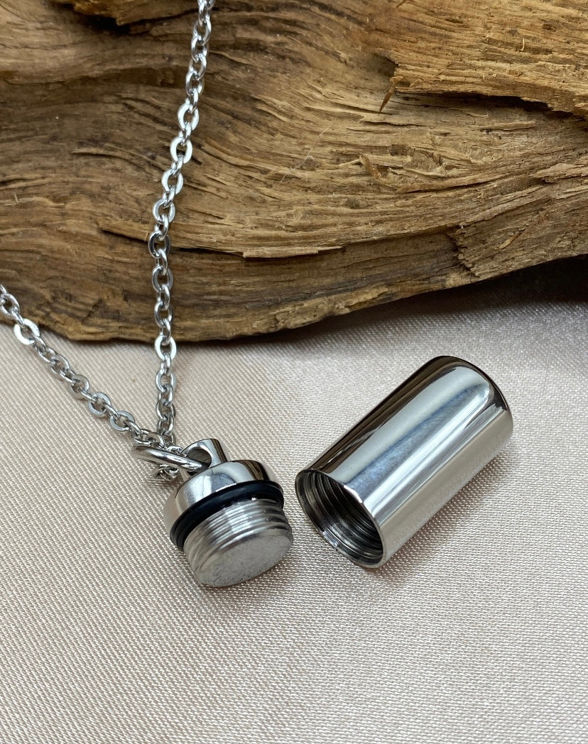 Keep your loved one or cherished pet close to your heart with the Small Cylinder Urn Necklace, a timeless piece of memorial jewelry designed for daily comfort and meaningful remembrance. Crafted from high-grade stainless steel, this durable and elegant pendant is perfect for holding a small portion of ashes, hair, dried flowers, or other special keepsakes.