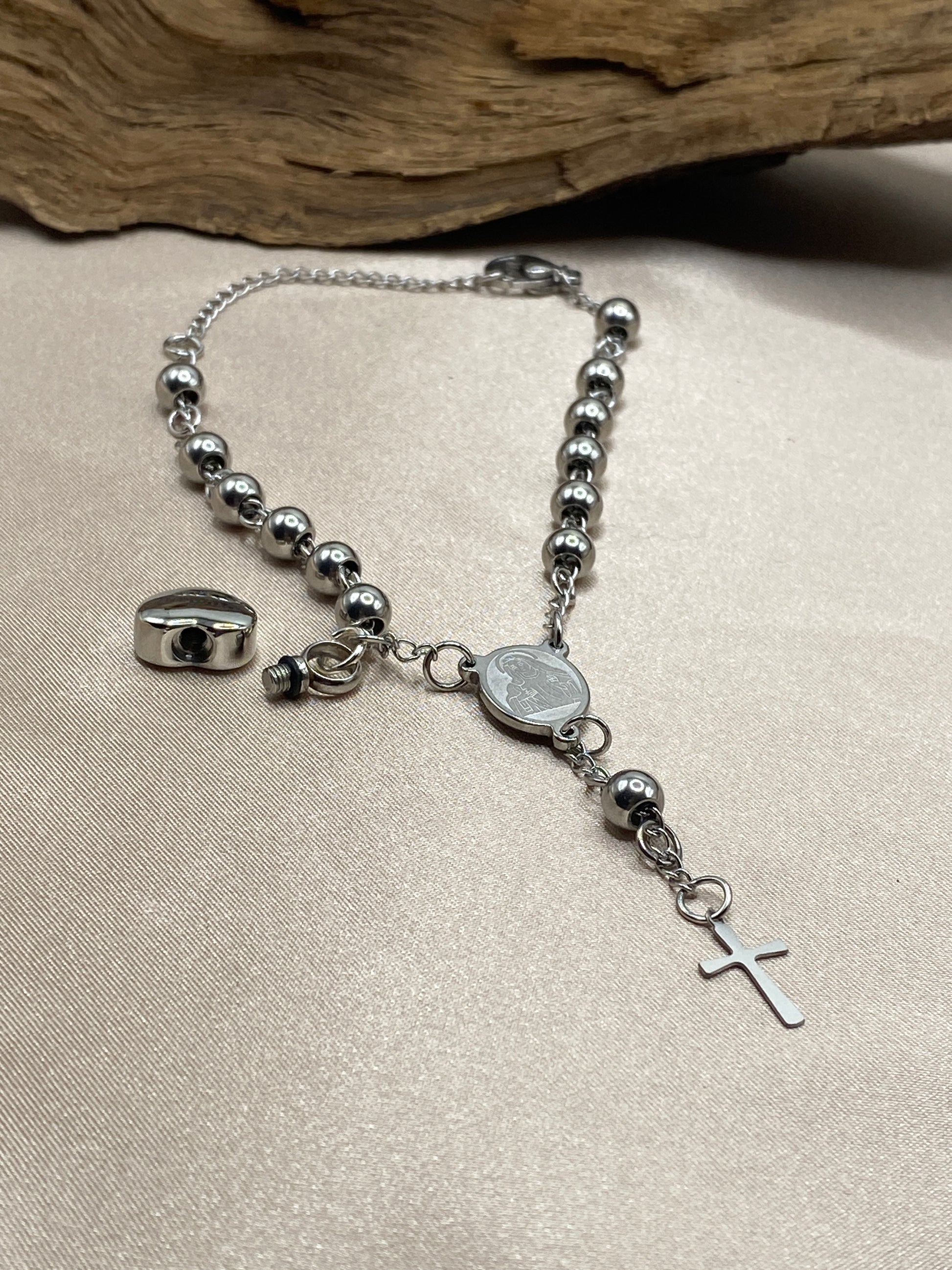 Style: Rosary cremation bracelet with heart urn and cross charm