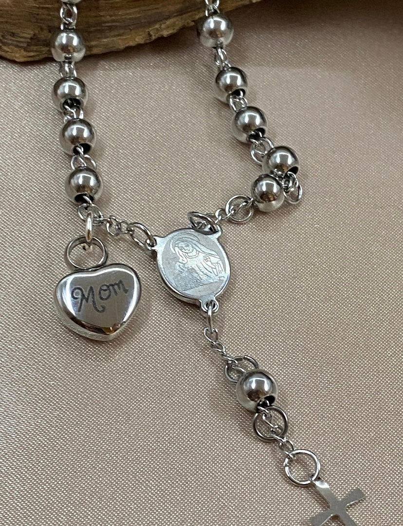 Rosary Urn Bracelet – Engraved 'Mom' Heart Keepsake Jewelry for Ashes