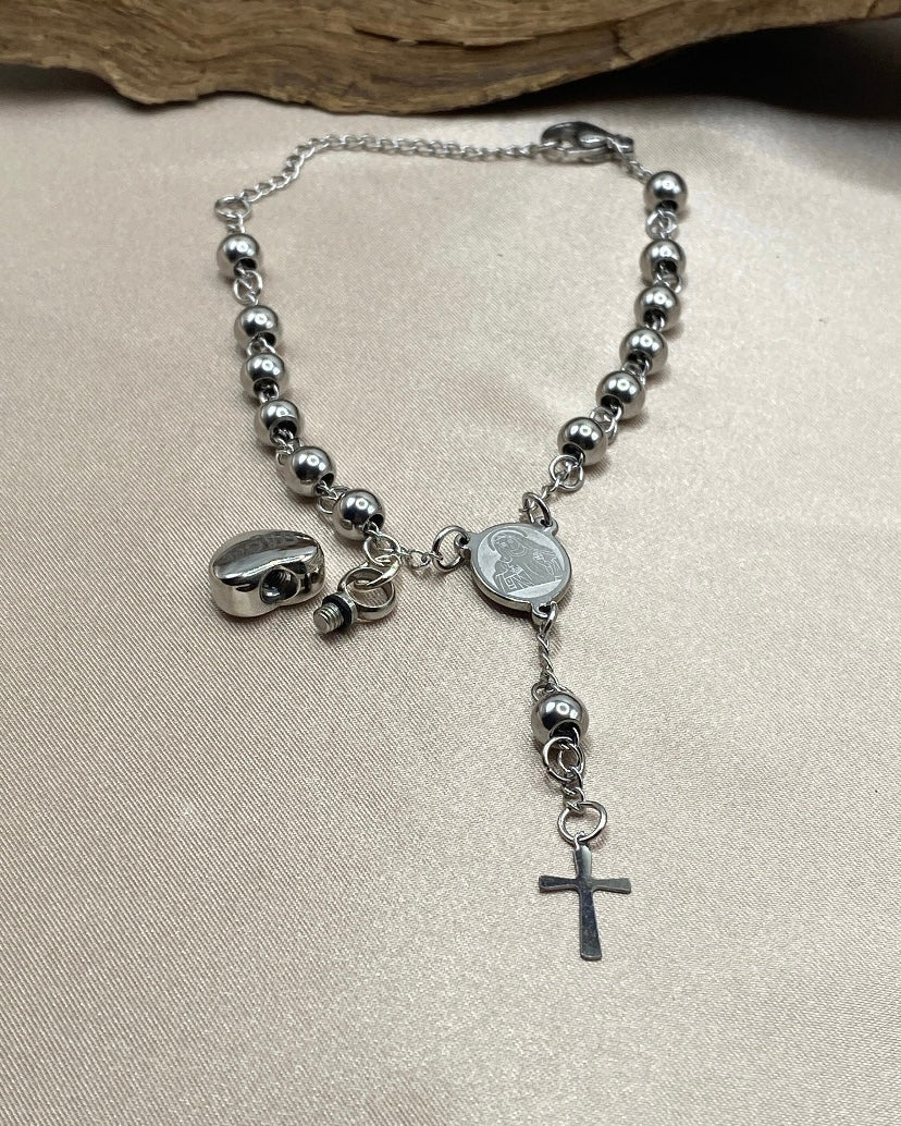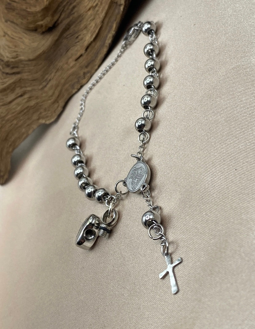 Style: Rosary cremation bracelet with heart urn and cross charm